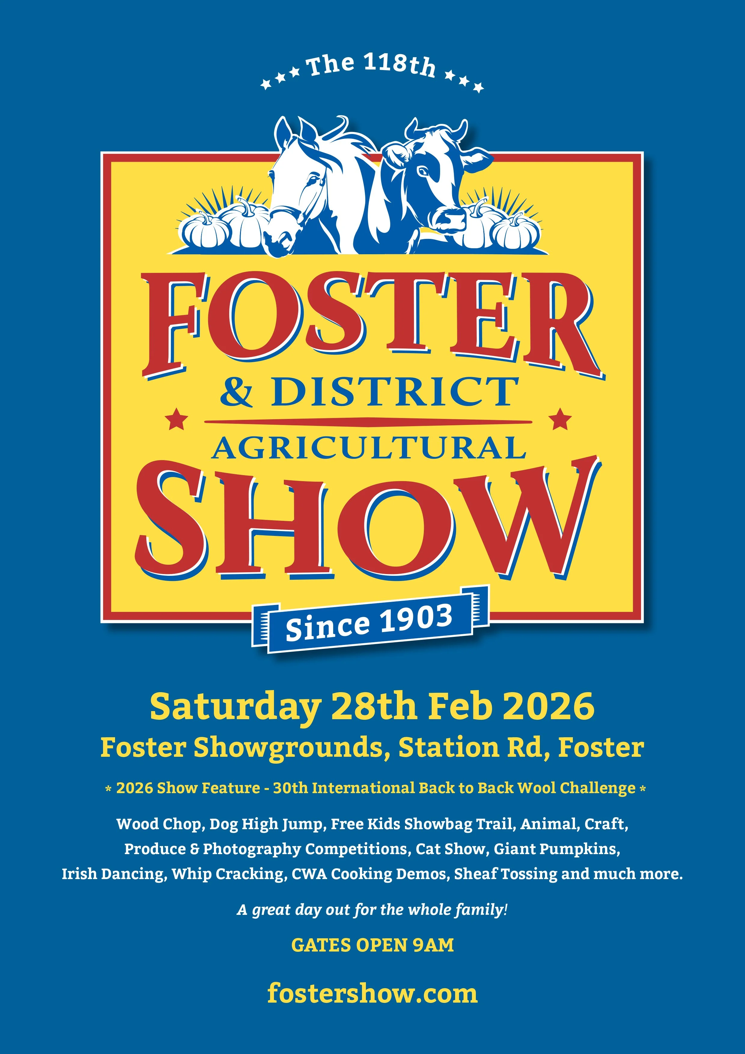 The 118th Foster & District Agricultural Show will be held on Saturday 28nd February 2026! We are excited to showcase many much loved favourite competitions and attractions as well as some new additions this year including ferret racing, a mullet competition and the inaugural Calf Classic! A great day out for the whole family.