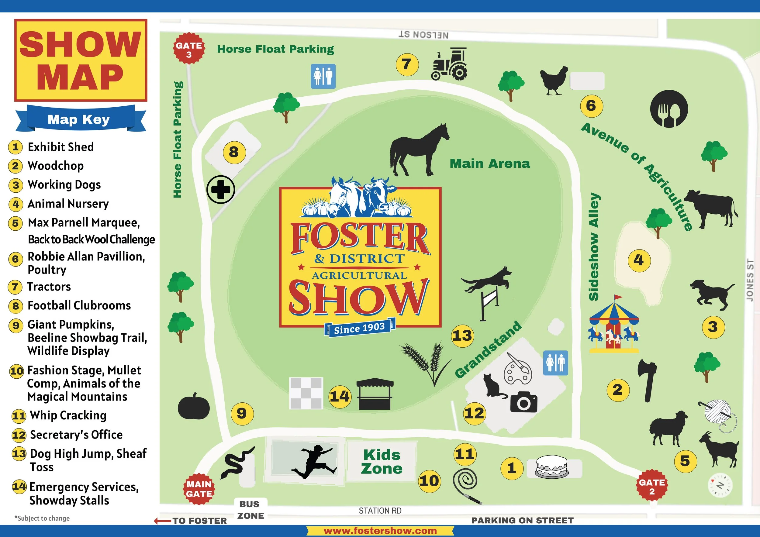 Get in early to park near the showgrounds. Otherwise make use of the FREE showday shuttle running between 10am and 4pm from: The Foster Secondary College, Foster VLine Bus stop; Foster Vet Clinic and the Rail Trail Car Park.